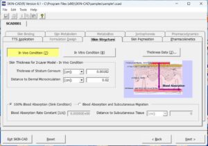 ③ 放出試験及び皮膚透過試験で求めた各種パラメータ,ヒトの皮膚構造(角層厚み,皮膚毛細血管までの距離),ヒトのPKパラメータ(分布容積,速度定数)をSKIN-CADに入力して,計算を実行しました.