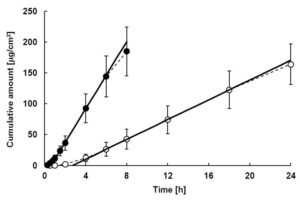 → ヘアレスマウスの正常皮膚(intact skin)と角層剥離皮膚(stripped skin)における累積透過量時間推移から透過速度(flux)と時間遅れ(time lag)を求めて,皮膚2層膜(角層+生きた皮膚)の拡散係数や分配係数を算出しました.